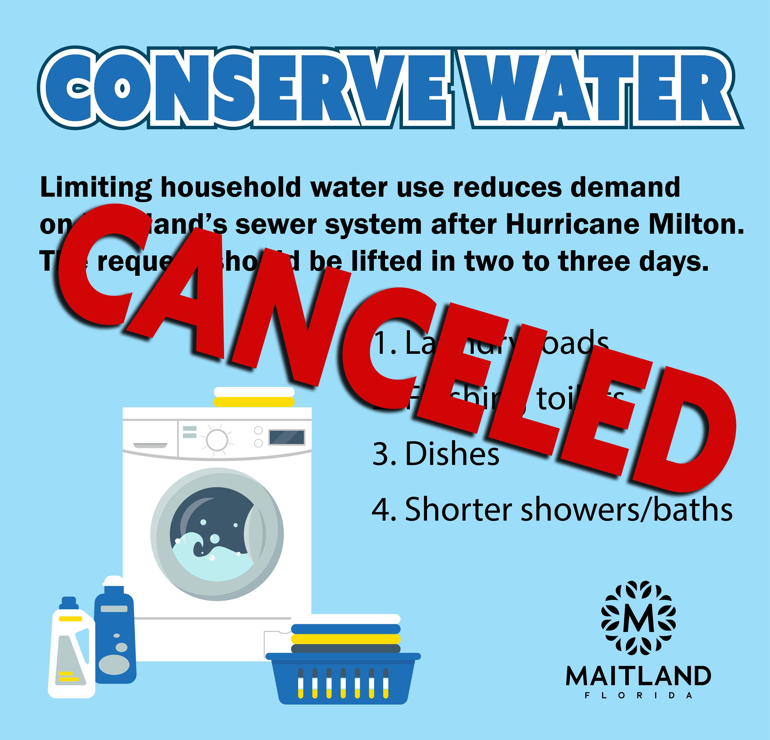 A water conservation notice from Hurricane Milton has been rescinded. All City of Maitland water and wastewater services are working properly following the storm.
